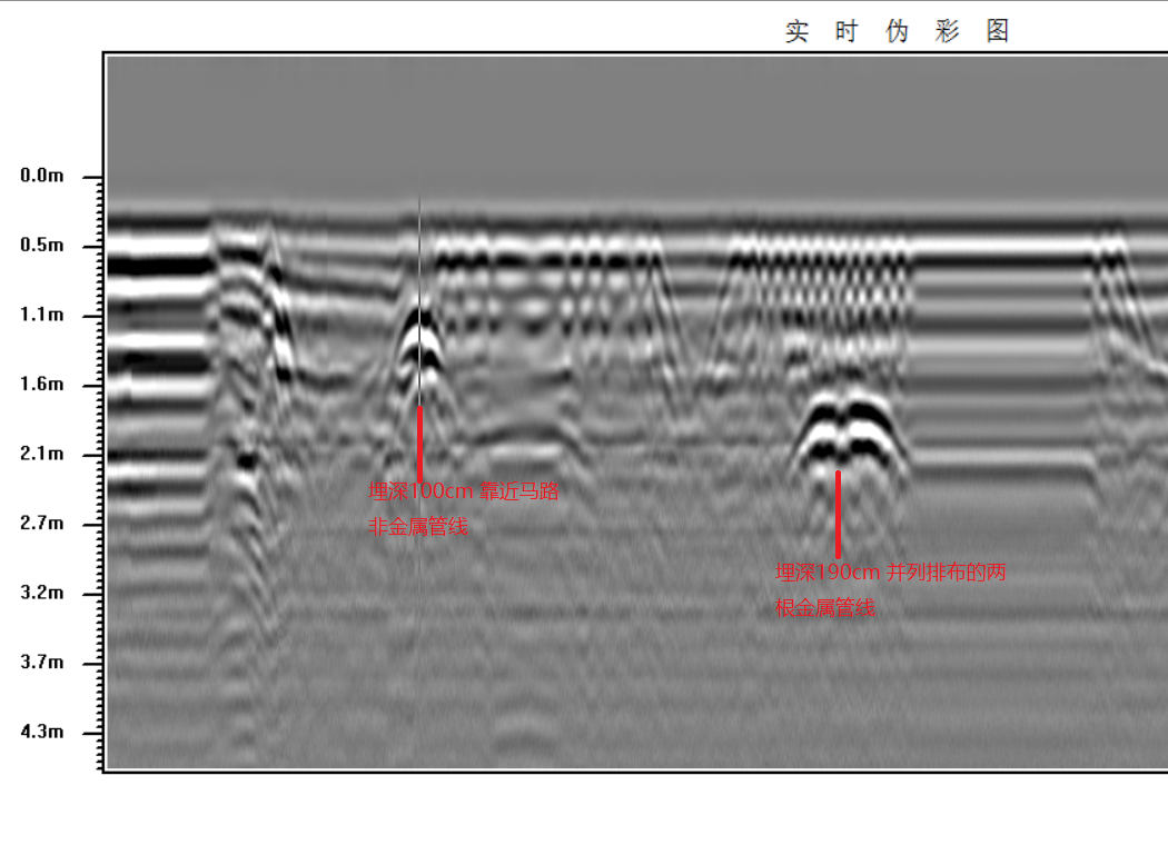 如图所示:总共测试到5根管线,但是其中,*右边一根非金属管线显示不完整,